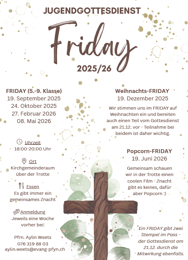 Zum Kennenlernen unseres kirchlichen Feierns wird ab der 5. Klasse 4x im Schuljahr ein Jugendgottesdienst am Freitagabend angeboten. Er findet im Kirchgemeinderaum und der Trotte Pfyn statt.