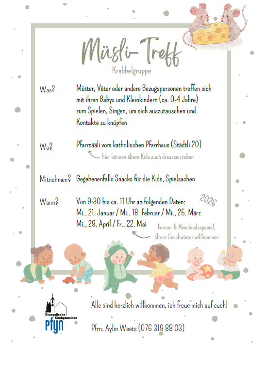 Kinder bereichern das Leben. Mit viel Elan und Freude werden 6 „Fiire mit de Chliine“– Gottesdienste von einem erfahrenen Team gestaltet. Eingeladen sind Vorschulkinder mit ihren Eltern. Es ist selbstverständlich, dass die Kinder ins kirchliche Feiern miteinbezogen werden. Mitfeiern lohnt sich!