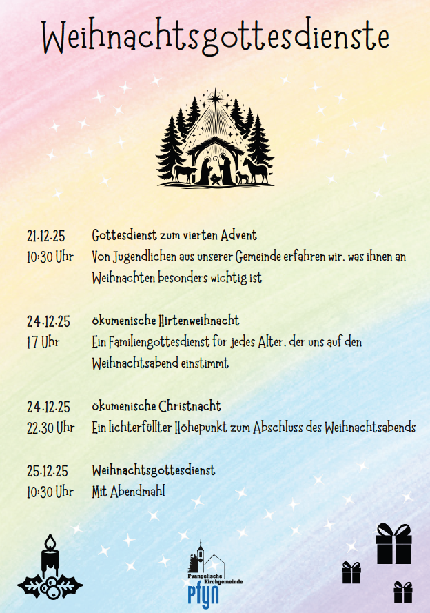 Daten: 21.12., (Kids-Weihnacht findet in der Kirche statt, gleiche Zeit wie Gottesdienst)